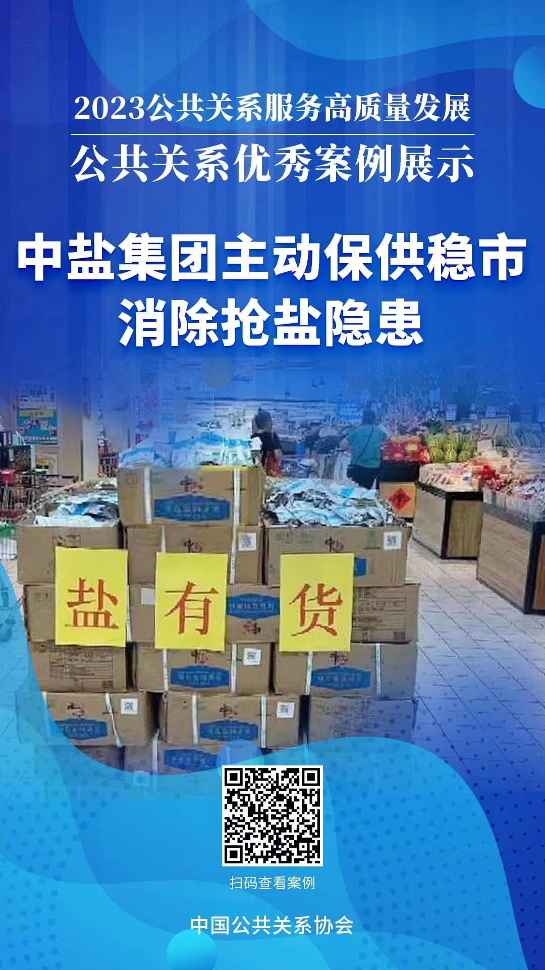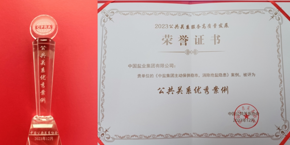 12月16日,由中国公共关系协会主办的以“公共关系服务高质量发展”为主题的2023年中国公共关系发展大会在北京举行。大会首次举办年度公共关系优秀案例展示,《中盐集团主动保供稳市 消除抢盐隐患》成功入选。来自国内十多所大学新闻学院和公共关系行业的35位权威专家,对收集到的120个有效案例进行多轮遴选,最终推选出20个年度优秀案例和15个展示案例,包括中盐集团在内的7家中央企业和国务院国资委新闻中心等获得优秀案例殊荣。中盐集团党委副书记敦忆岚代表集团公司出席大会,中国盐业股份有限公司副总经理贾建军一同参加。